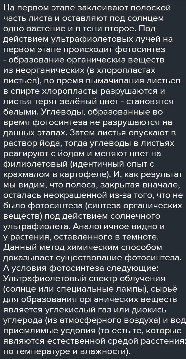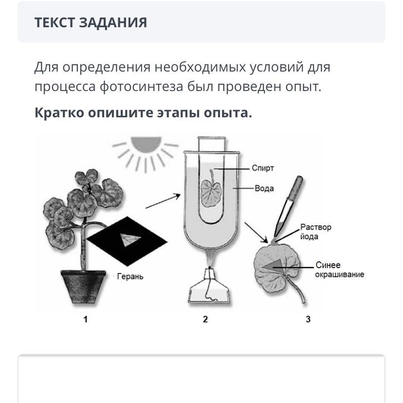 Для определения необходимых условий для процесса фотосинтеза был проведен опыт.