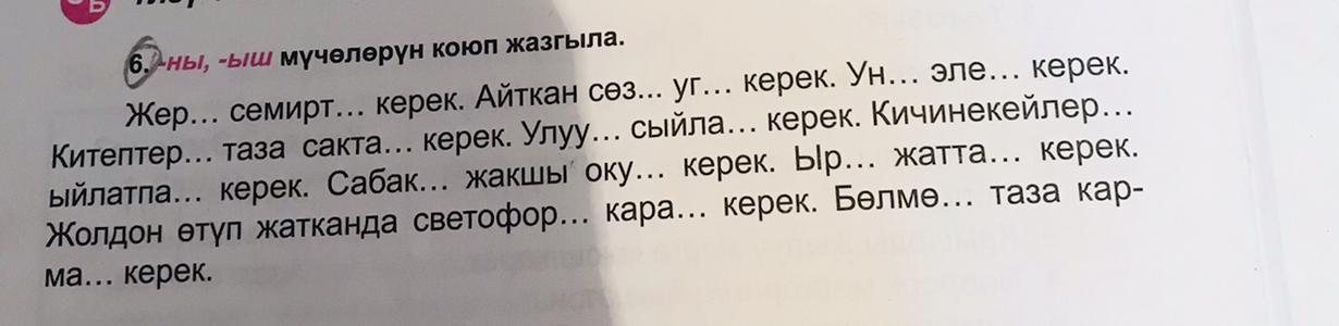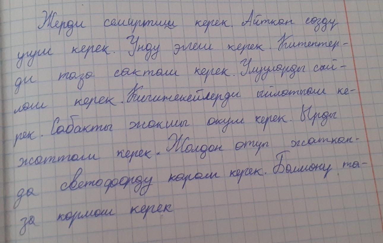 Жерди семиртиш керек. Айткан сөздү угуш керек.Унду элеш керек. Китептерди таза сакташ керек.Улууларды сыйлаш керек. Кичинекейлерди ыйлатпаш керек. Сабакты жакшы окуш керек. Ырды жатташ керек. Жолдон өтуп жатканда светофорду караш керек. Бөлмөнү таза кармаш керек.