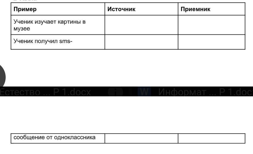 Расмотрите и заполните таблицу.Прочитайте примеры,определите источник и приёмник информации