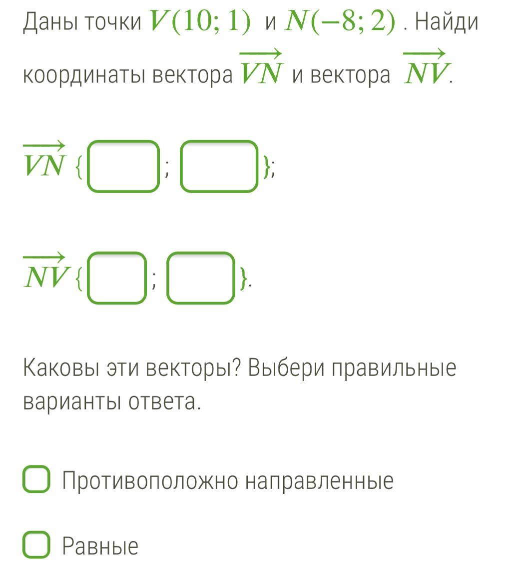 VN{-18; 1}, NV{18; -1} - равные по длине, противоположно направленные
