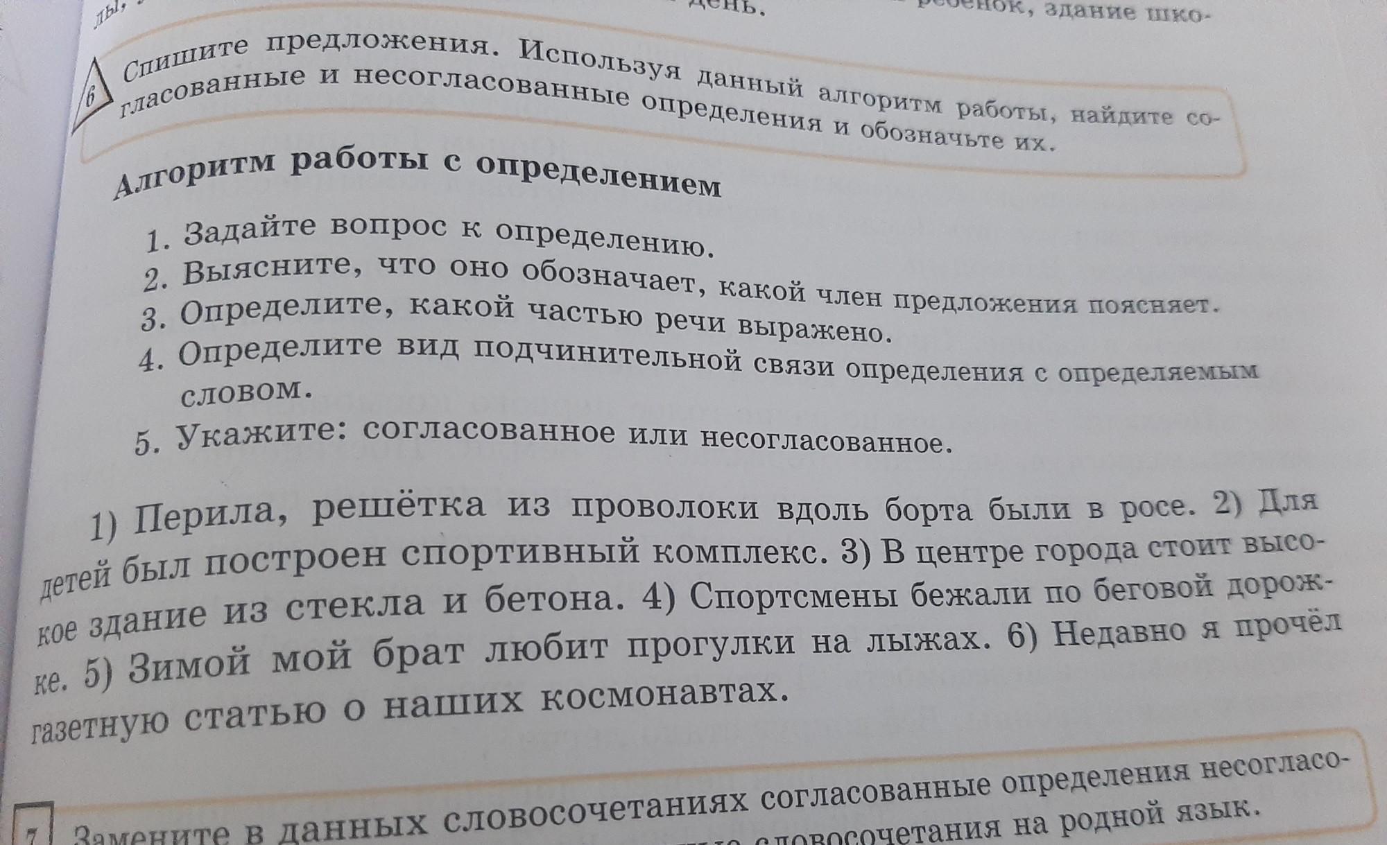 Спишите предложения . Используя данный алгоритм работы, найдите согласованые и несогласованные определения и обозначьте их ? ,