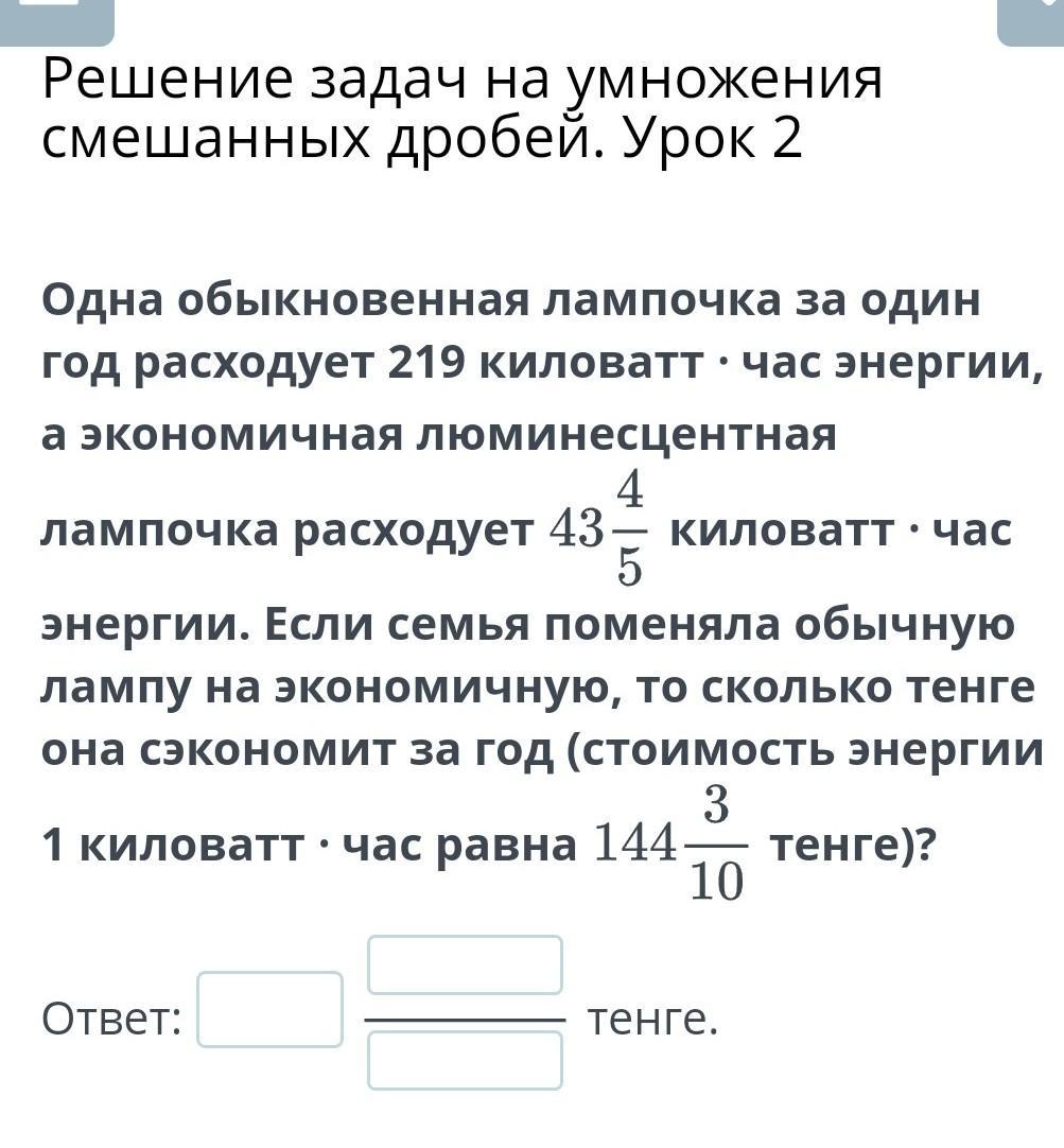 219/5 * 1443/10 = 316017/50 = 6320. 17/50 (тг) - заплатят за 1 год за экономичную лампочку
