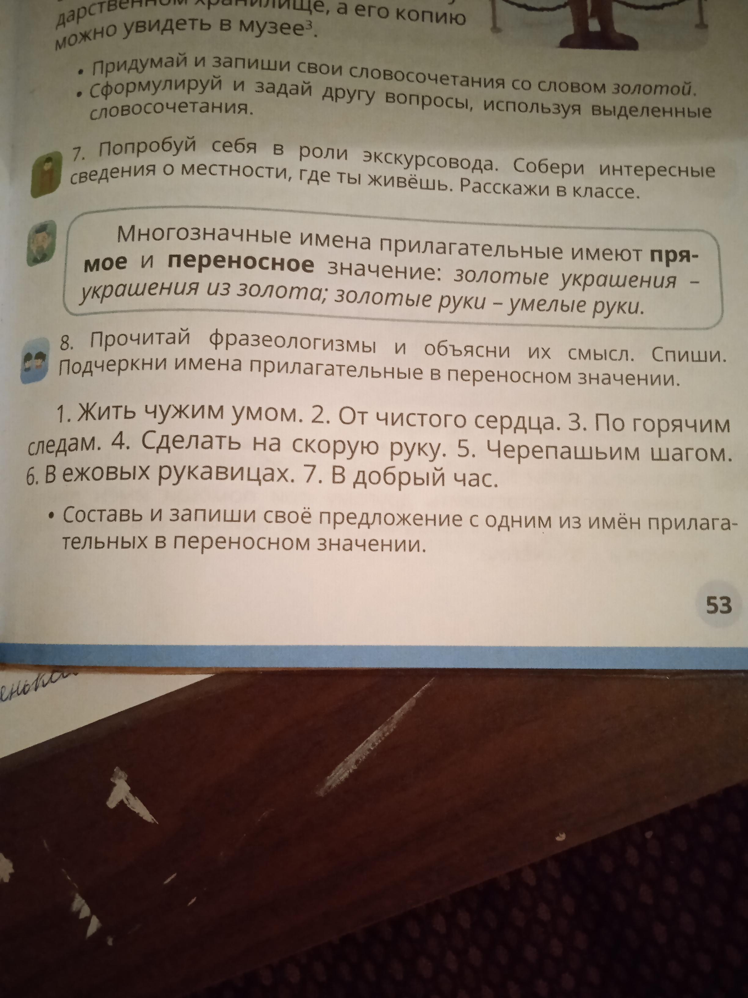 Задание 8. Прочитай фразеологизмы и объясни их смысл. Спиши. Подчеркни имена прилагательные в переносном значении.