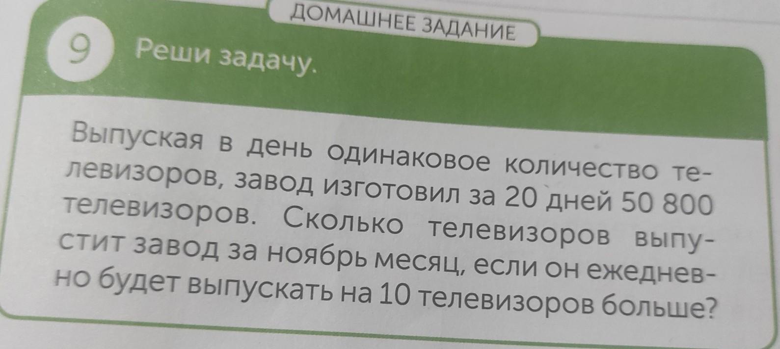 ДОМАШНЕЕ ЗАДАНИЕ 9 Реши задачу. Выпуская в день одинаковое количество те- левизоров, завод изготовил за 20 дней 50 800 телевизоров. Сколько телевизоров выпу- стит завод за ноябрь месяц, если он ежеднев- но будет выпускать на 10 телевизоров больше? можно пж типа там t,v,a сделать пж