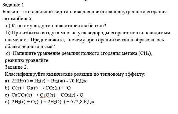 Бензи́н — горючая смесь лёгких углеводородов с температурой кипения от +33 до +205 °C (в зависимости от примесей). Плотность около 0,71...0,76 г/см³. Теплотворная способность около 10 600 ккал/кг (44,4 МДж/кг, 32,7 МДж/литр). Температура замерзания около −60 °C в случае использования специальных присадок.