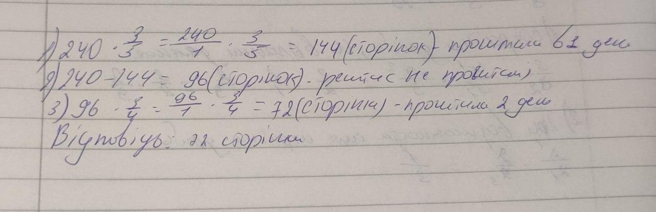 Підручнику 240 сторінок першого дня учениця прочитала 3/5 всі сторінок а другого дня 3/4 решти скільки сторінок прочитала учениця другого дня?