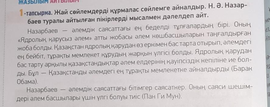 1-тапсырма. Жай сөйлемдерді құрмалас сөйлемге айналдыр. Н.Ә Назарбаев туралы айтылған пікірлерді мысалмен дәлелдеп айт.