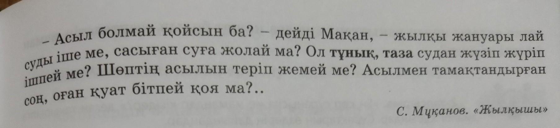 Асыл болмай қойды -дейді Мақан, - жылқы жануары лай суды ішпейді, сасыған суға жоламайды. Ол тұнық таза судан жүзіп журіп ішпейді. Шөптің асылын теріп жемейді. Асылмен тамақтандырғаң соң өған қуат бітпей қояды.