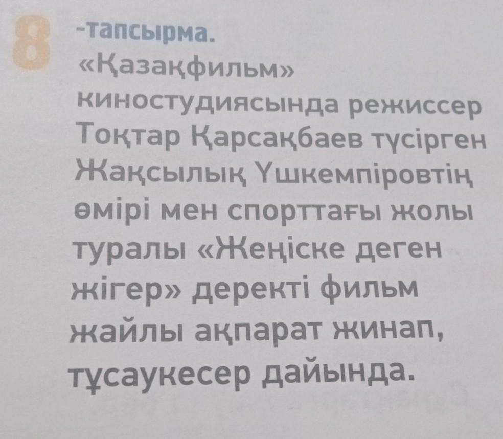 8-тапсырма. «Қазақфильм» киностудиясында режиссер Тоқтар Қарсақбаев түсірген Жақсылық Үшкемпіровтің өмірі мен спорттағы жолы туралы «Жеңіске деген жігер» деректі фильм жайлы ақпарат жинап, тұсаукесер дайында.