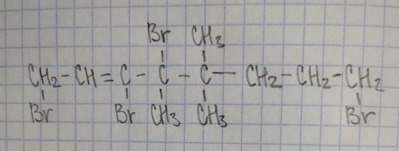 Ответ: CH2(Br)-CH=C(Br)-C(Br снизу, СН3 сверху)-С(Br снизу, CH3 сверху)-CH2-CH2-CH3
