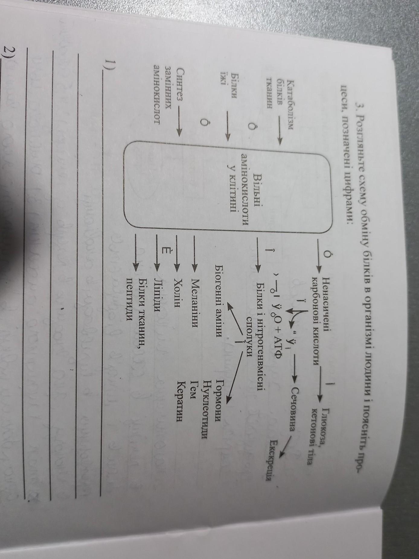 3. Розгляньте схему обміну білків в організмі людини і поясніть про- цеси, позначені цифрами: Глюкоза, кетонові тіла Ненасичені і карбонові кислоти T , — Сечовина 2 ! ў0+ АТФ Білки і нітрогенымісні сполуки * ў Екскреція Катаболізм білків Канин д Вільні амінокислоти у клітині Білки жі Біогенні аміни Гормони Нуклеотиди Ге Кератин д 11 Меланіни Холін Синтез замінних ALI Ліпіди.Пж срочно