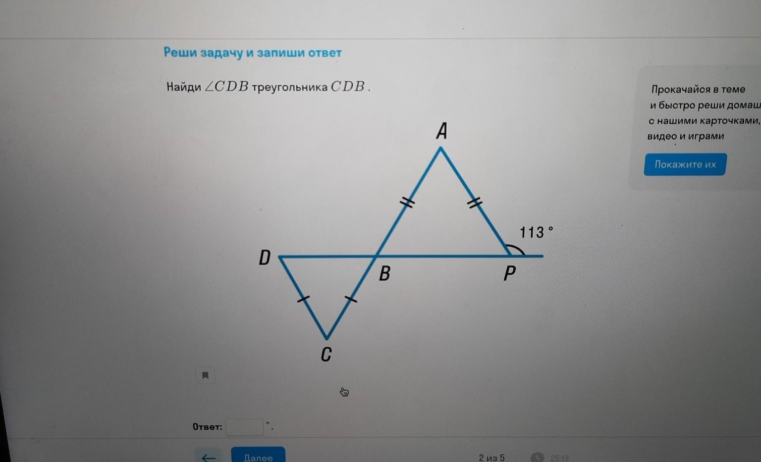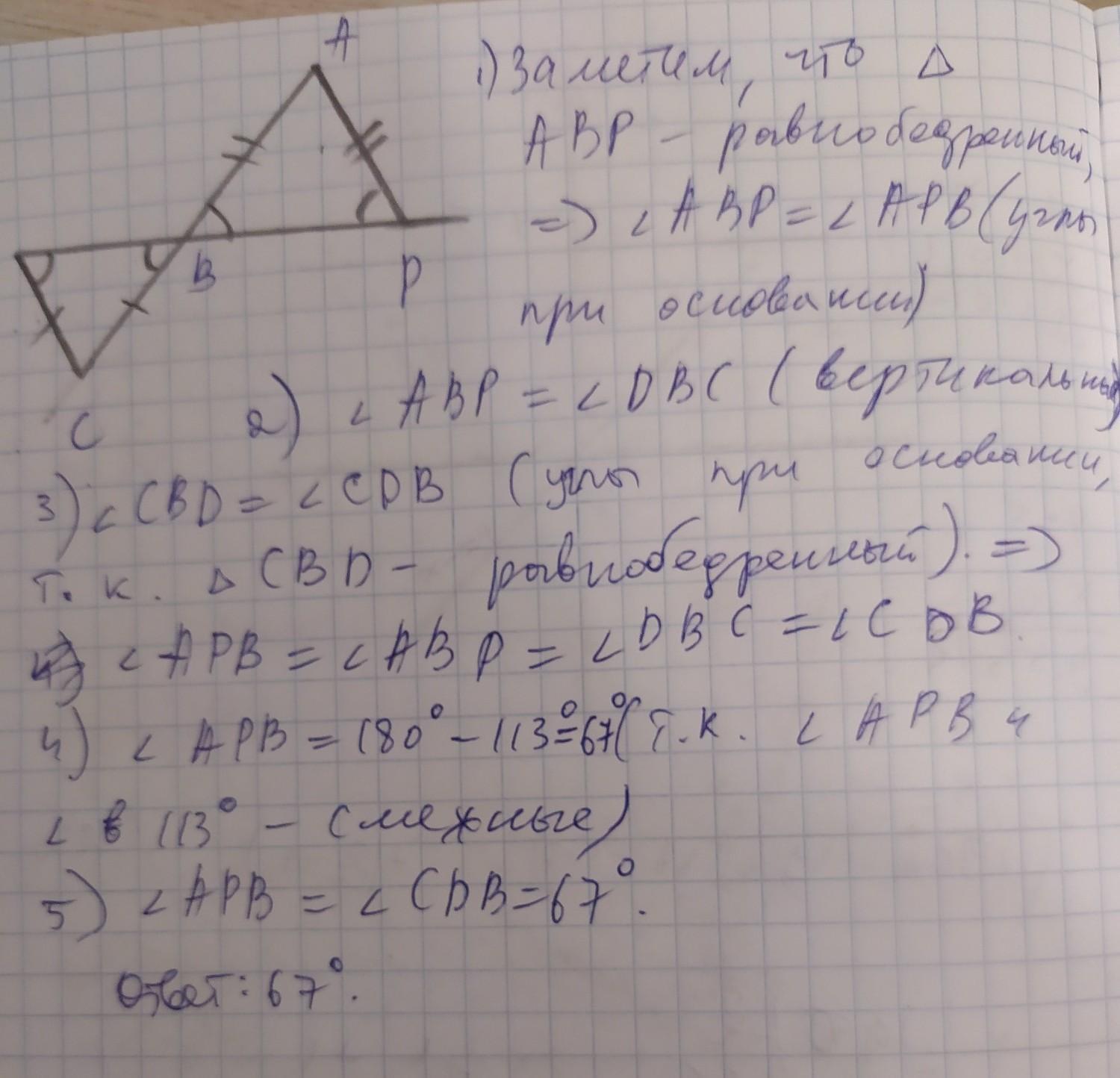 Угол BPA = 180 - 113 = 67°