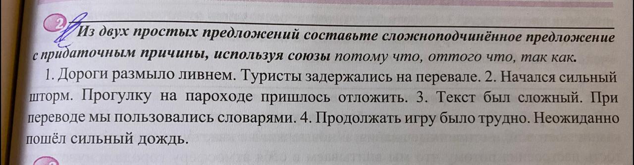 1.Туристы задержались на перевале, потому что дороги размыло ливнем 2.прогулку на пароходе пришлось отложить, так как начался сильный шторм 3. При переводе мы пользовались словарями, потому что текст был сложный 5. Продолжать игру было трудно, так как пошёл сильный дождь.