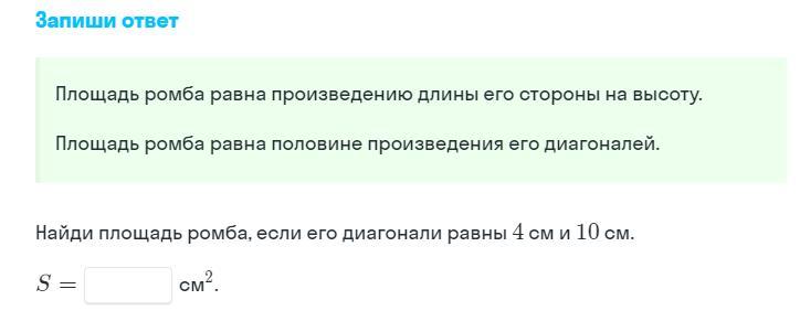 Площадь ромба равна половине произведения его диагоналей. Даны диагонали 4 и 10 см. (4 *10) : 2 = 20см²