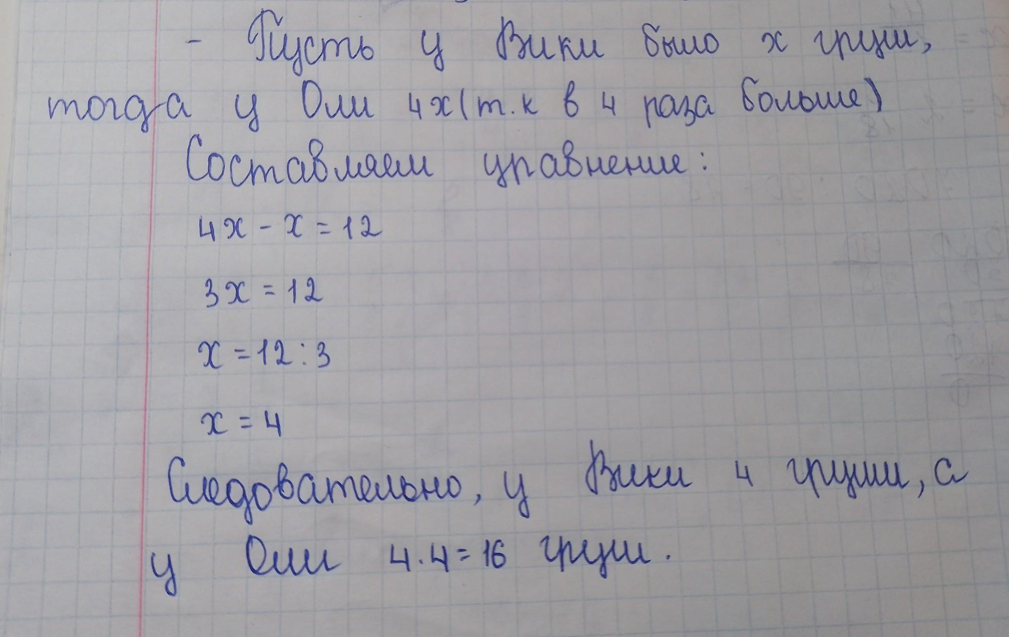 помогите плиз решить уровнением У Вики было в 4 раза меньше груш, чем у Оли. При этом у Оли было на 12 груш больше, чем у вики. Сколько груш было у Вики? У Оли?