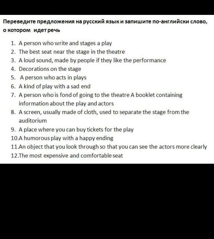 1. Человек, который пишет и ставит пьесу 2. Лучшее место у сцены в театре 3. Громкий звук, издаваемый людьми, если им нравится представление 4. Декорации на сцене 5. Человек, играющий в пьесах 6. Своеобразный спектакль с печальным концом 7. Любитель походов в театр Буклет с информацией о пьесе и актерах 8. Экран, обычно тканевый, отделяющий сцену от зрительного зала 9. Место где можно купить билеты на спектакль 10. юмористический спектакль со счастливым концом 11. объект, через который вы смотрите, чтобы лучше видеть актеров 12. самое дорогое и удобное место