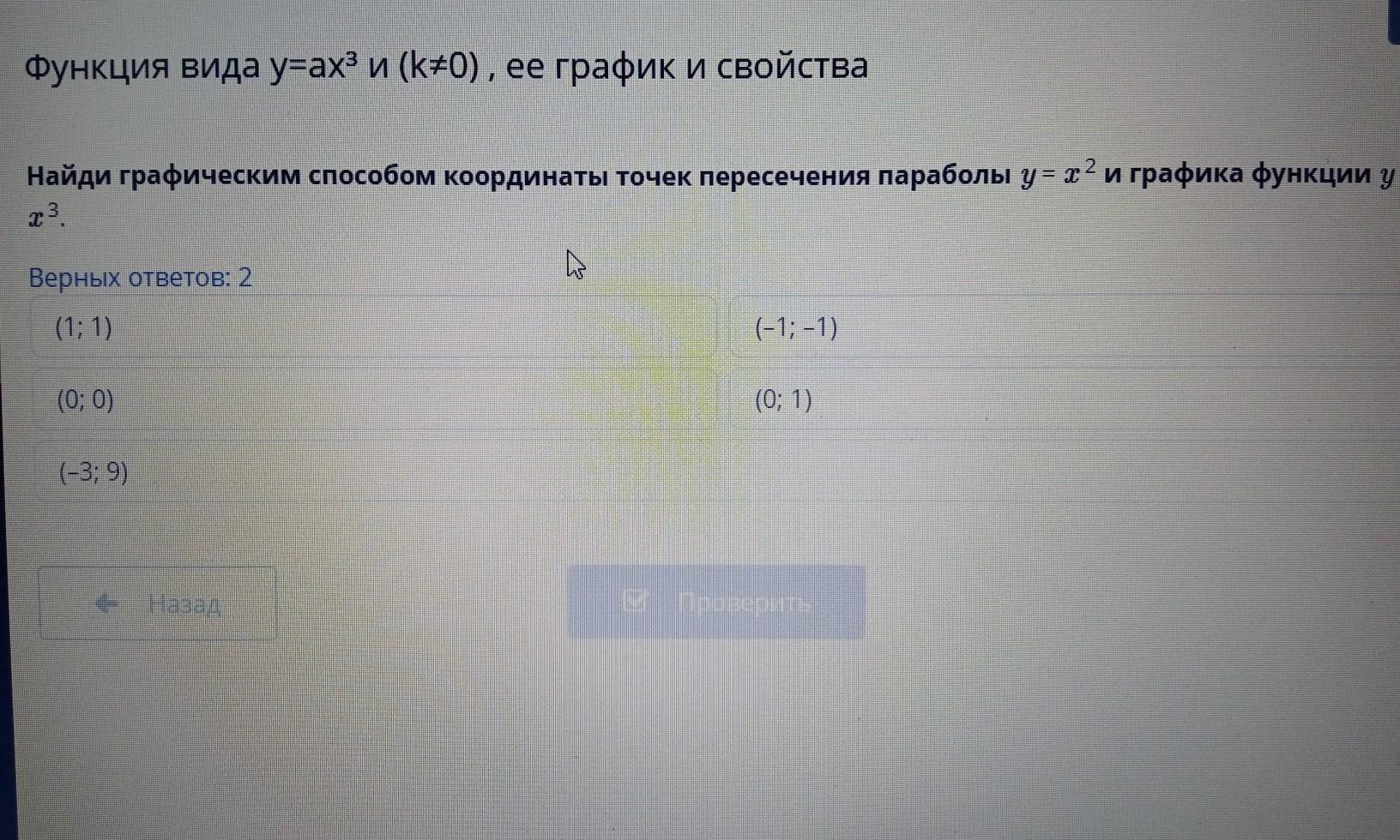 Найди графическим способом координаты точек пересечения параболы у = х2 и графика функции y = 33 Верных ответов: 2 (1; 1) (-1; -1) (0; 0) (0; 1) (-3; 9)