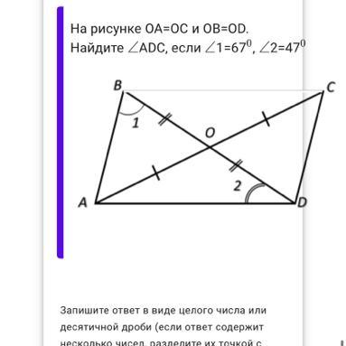 Так как OA = OC и OB = OD (по условию задачи), то ABCD - параллелограмм (по признаку параллелограмма). Следовательно, угол BDC = углу ABD = 67° (накрест лежащие углы при параллельных прямых и секущей). Отсюда находим угол ADC = 47° + 67° = 114°.