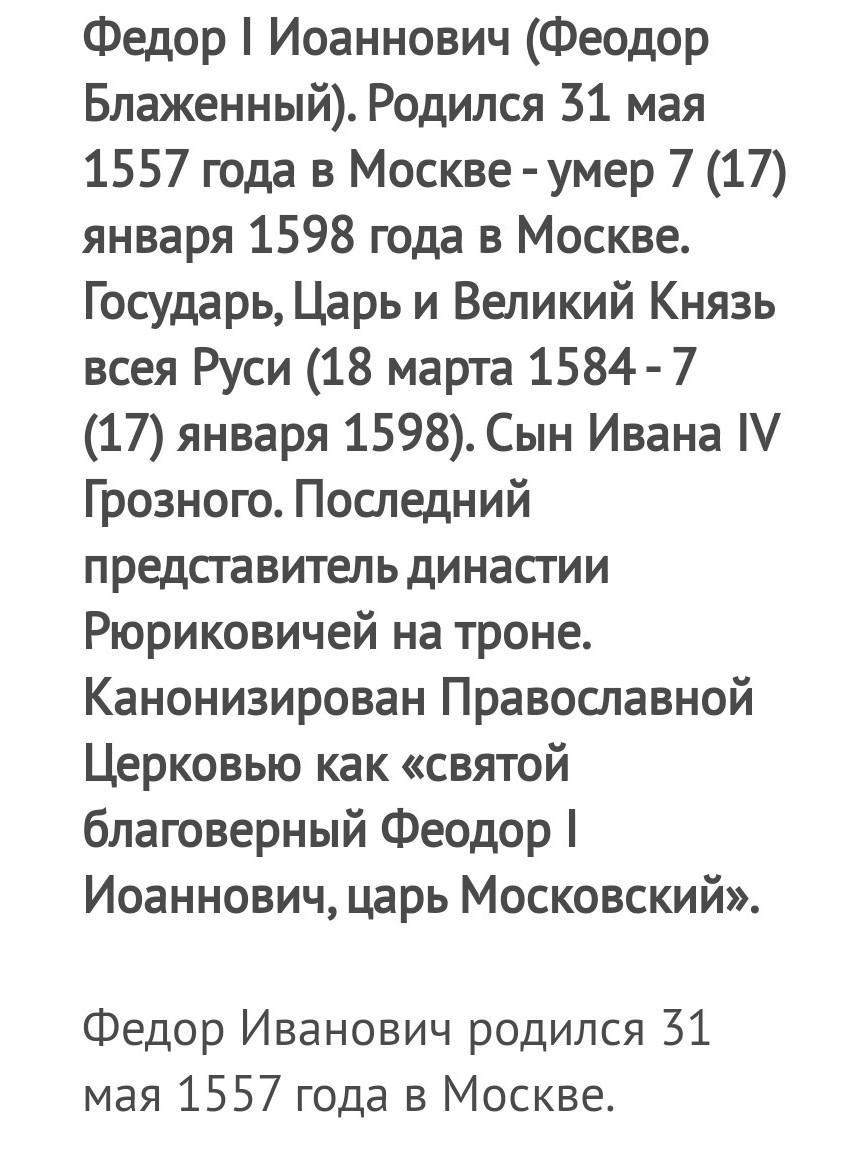 Ответ:8 марта 1584г. на московский престол взошел 27-летний Федор Иванович, третий сын грозного царя Ивана и его первой жены Анастасии Романовны Юрьевой. Поначалу он имел мало шансов на корону, но трагические события в царской семье сделали его единственным наследником: первенец, Дмитрий, утонул во младенчестве, во время богомольной поездки родителей в Кирилло- Белозерский монастырь; старший брат Иван, 28 лет, считавшийся наследником престола, за полтора года до смерти отца пал жертвой его слепой ярости.