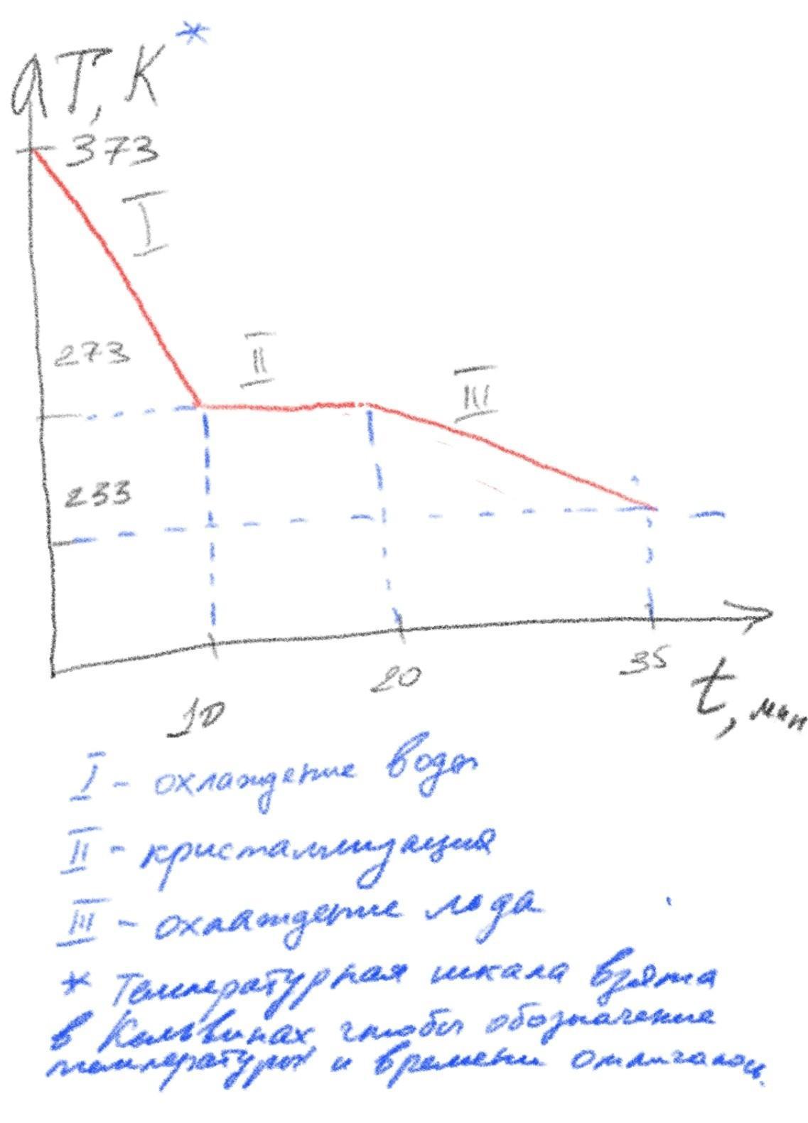 Воду охлаждают от 100 °С до 0 °С за 10 мин, затем в течение 10 мин она отвердевает, превращаясь в лёд, наконец, 15 мин лёд охлаждают до −40 °С. Постройте график зависимости температуры тела от времени. Подпишите процессы.