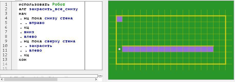 Напишите алгоритм для Робота, закрашивающий все клетки, расположенные ниже стены