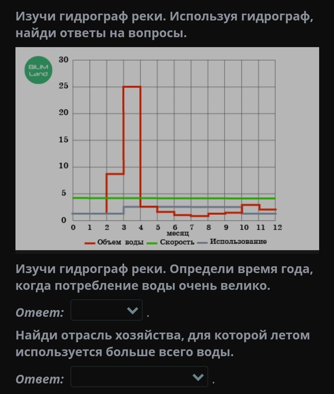 Изучи гидрограф реки. Определи время года. когда потребление воды очень великою