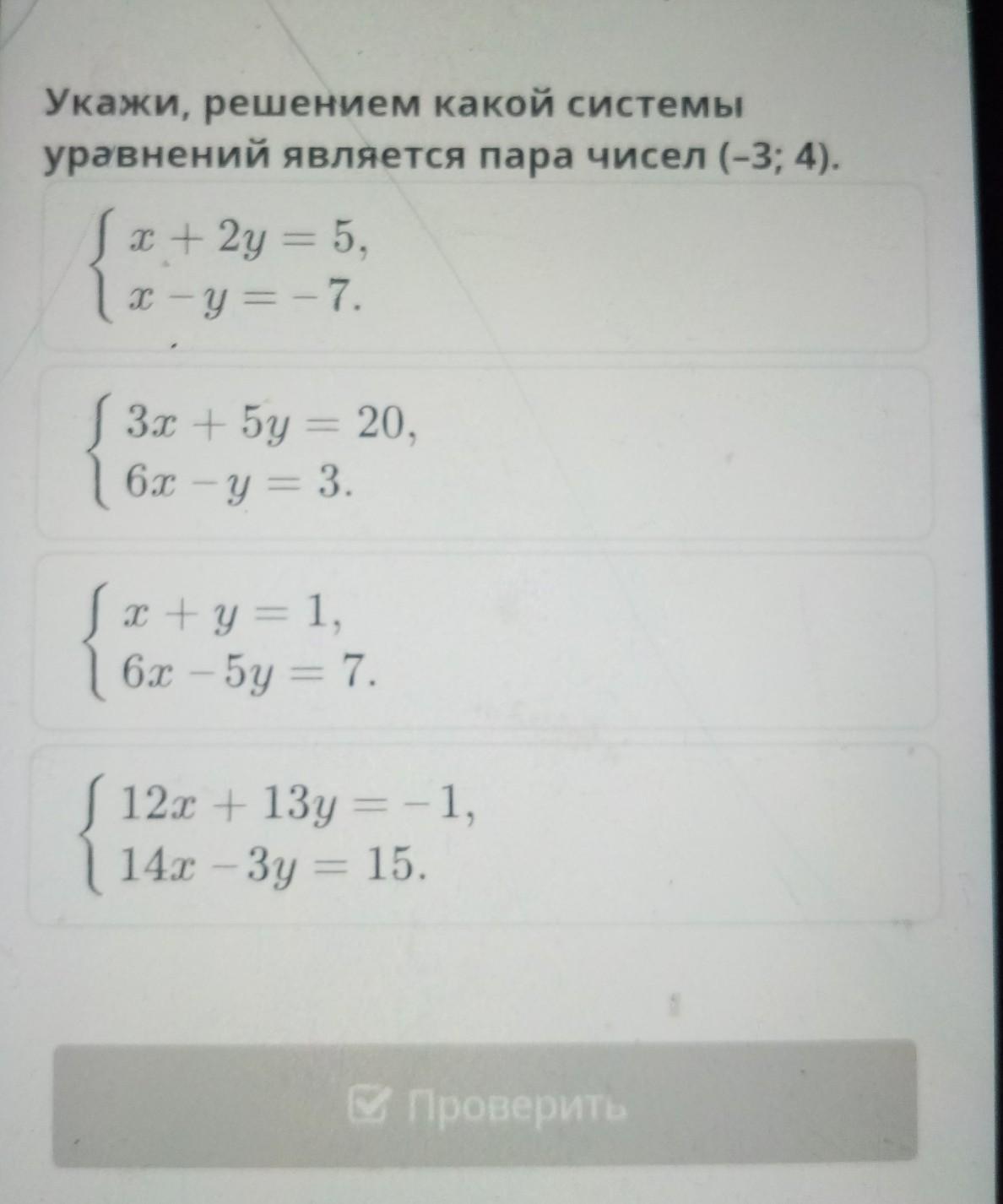Укажи, решением какой системы уравнений является пара чисел (-3; 4). 52 + 2y = 5, х — у = -7. Е 3х + 5 = 20, бах — у = 3. х+у= 1, бz – бу = 7. 12x + 13y = -1, 147 – 3y = 15. Быстро пжпжп
