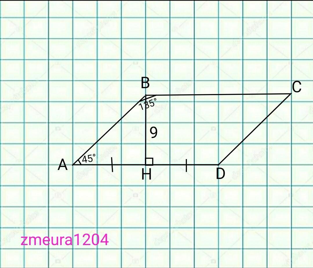 Второй угол параллелограма равен 180°-135°=45°. Высота образует прямоугольный равнобедренный треугольник. Сторона равна 9*2=18; S=9*18=