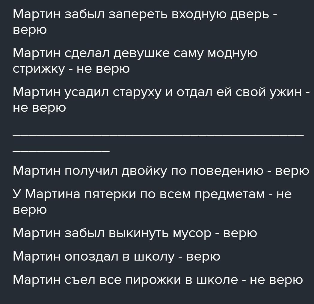 да там нужно была по тесту например : МАРТИН ИСКАЛ ПРЕСРАСНУЮ НЕЩНОКОМКУ -ВЕРЮ 2.ПРЕСРАСНАЯ НЕЗНОКОМКА ВЕДЬМА-НЕ ВЕРЮ 3.У ПРЕСРАСНОЙ НЕЗНОКОМКИ БЫЛИ КОРОТКИЕ СУХИЕ ВОЛОСЫ - НЕ ВЕРЮ Вот примерно так а не как ты школа какая школа