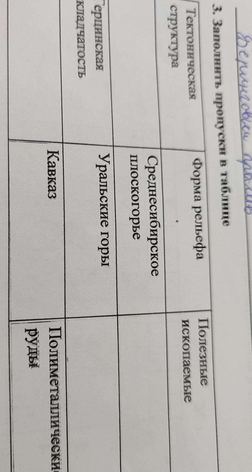 3. Заполнить пропуски в таблице Форма рельефа Тектоническая структура Полезные ископаемые Среднесибирское плоскогорье Уральские горы Герцинская складчатость Кавказ Полиметаллические руды