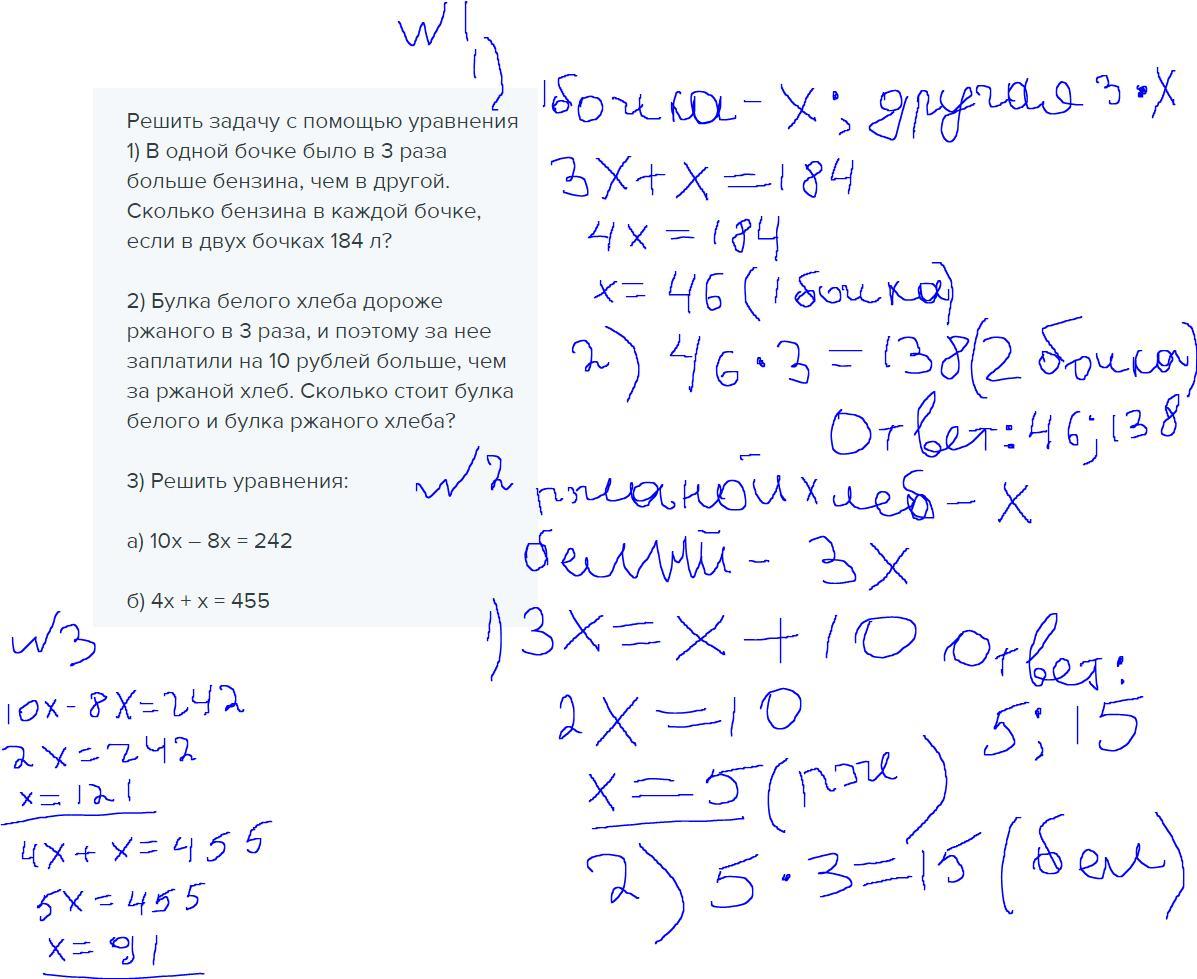 1) В одной бочке было в 3 раза больше бензина, чем в другой. Сколько бензина в каждой бочке, если в двух бочках 184 л?