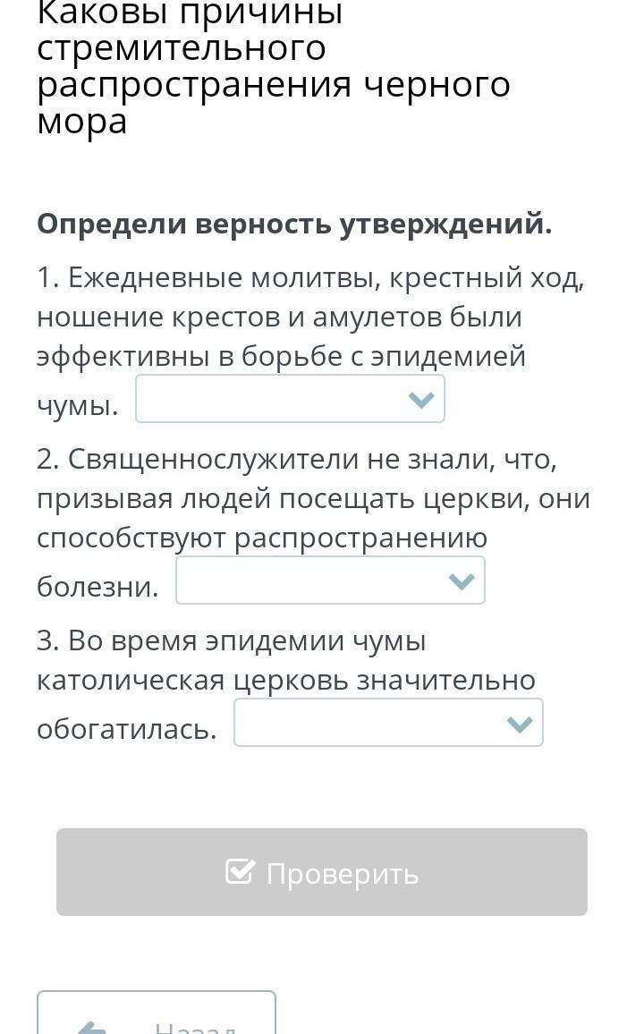 Ежедневные молитвы, крестный ход, ношение крестов и амулетов были эффективны в борьбе с эпидемией чумы. 2. Священнослужители не знали, что, призывая людей посещать церкви, они способствуют распространению болезни. 3. Во время эпидемии чумы католическая церковь значительно обогатилась