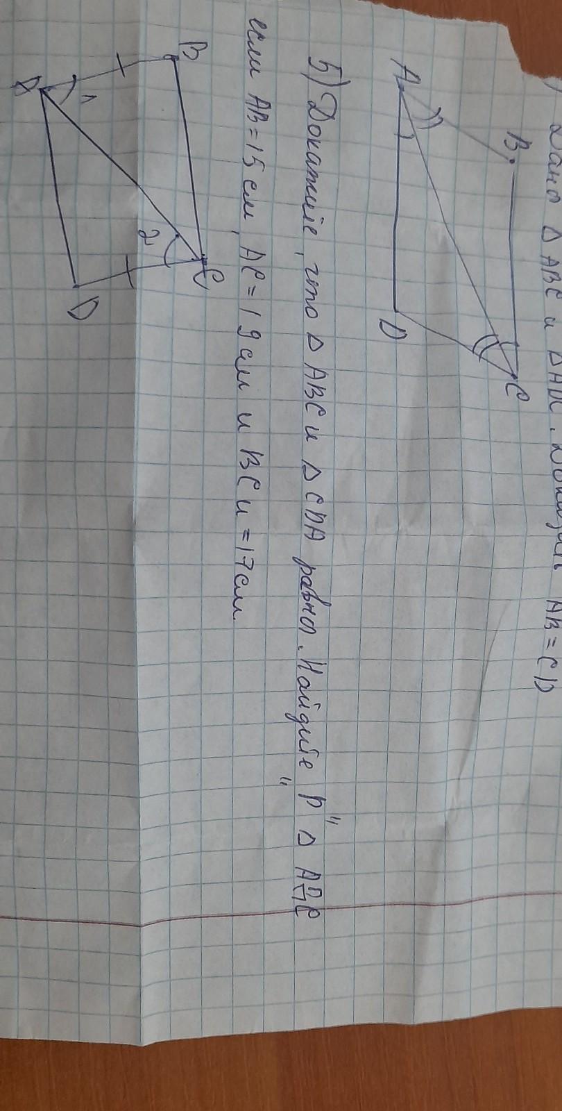 углы на рисунке отмечены одинаковыми чёрточками (где то одна чёрточка, где то две) это значит, что такие углы соответственно равны, а это уже значит, что треугольники равны. Соответственно AB=CD, BC=AD, таким образом периметр ADC = 15+19+17 = 51см