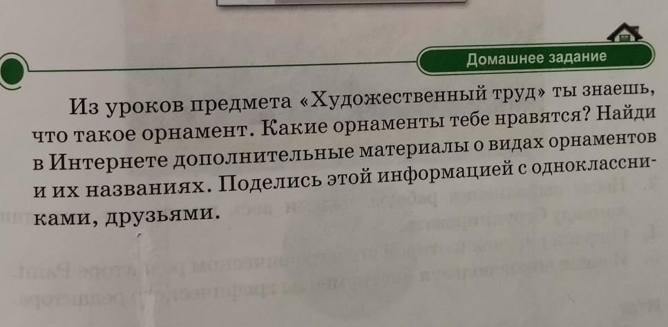 Домашнее задание Из уроков предмета «Художественный труд» ты знаешь, что такое орнамент. Какие орнаменты тебе нравятся? Найди в Интернете дополнительные материалы о видах орнаментов и их названиях. Поделись этой информацией с одноклассни- ками, друзьями.