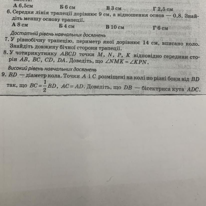 9: у коло можно вписати рівносторонній трикутник, тому бісектриса його кута може бути радіусом, діаметром