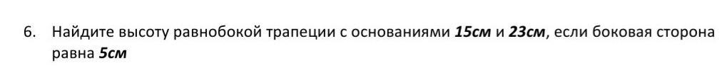 (6)Найдите высоту равнобокой трапеции с основаниями 15см и 23см, если боковая сторона равна 5см