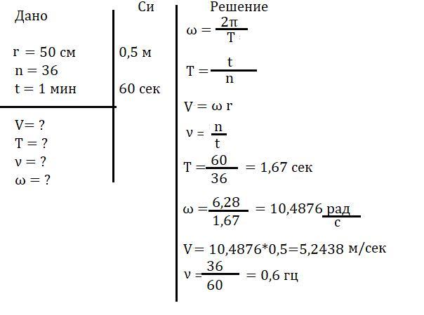 1. Шарик, закрепленный на нити длиной 50 см, совершает 36 оборотов в 1 мин. Найдите частоту и период вращения шарика, его линейную и угловую скорости. Можно и дано пж