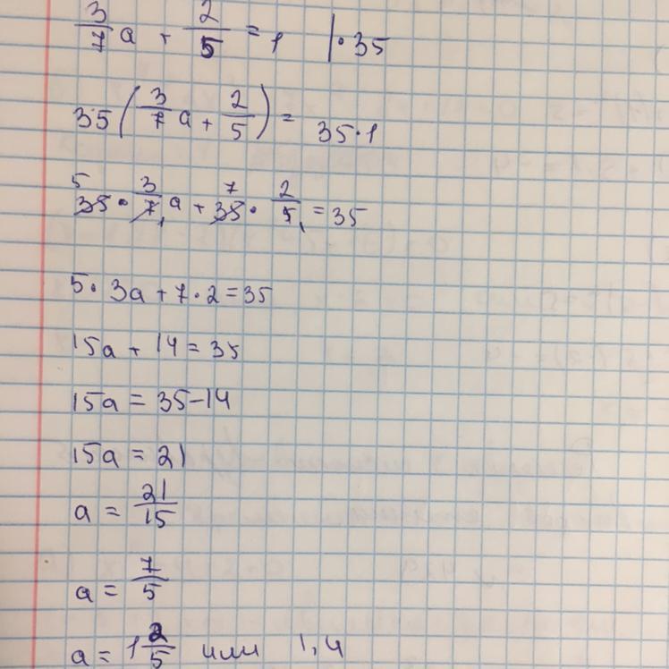 3/7•7/5+⅖= 3/5+⅖=5/5=1