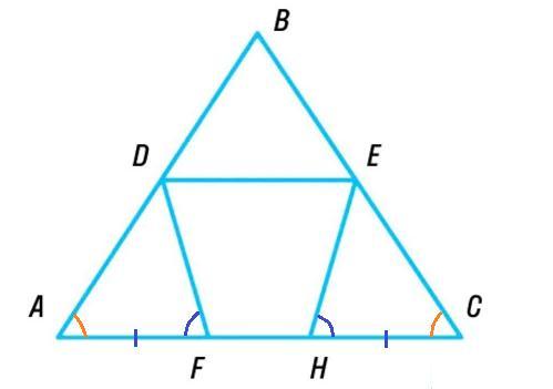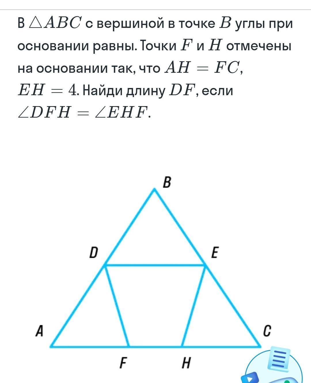 в ABC с вершиной в точке В углы при основании равны. Точки F и Н отмечены на основании так, что AH = FC , EH = 4 Найди длину DF, если DFH= EHF . даю 50 баллов можно быстро!!!!!! просто ответ
