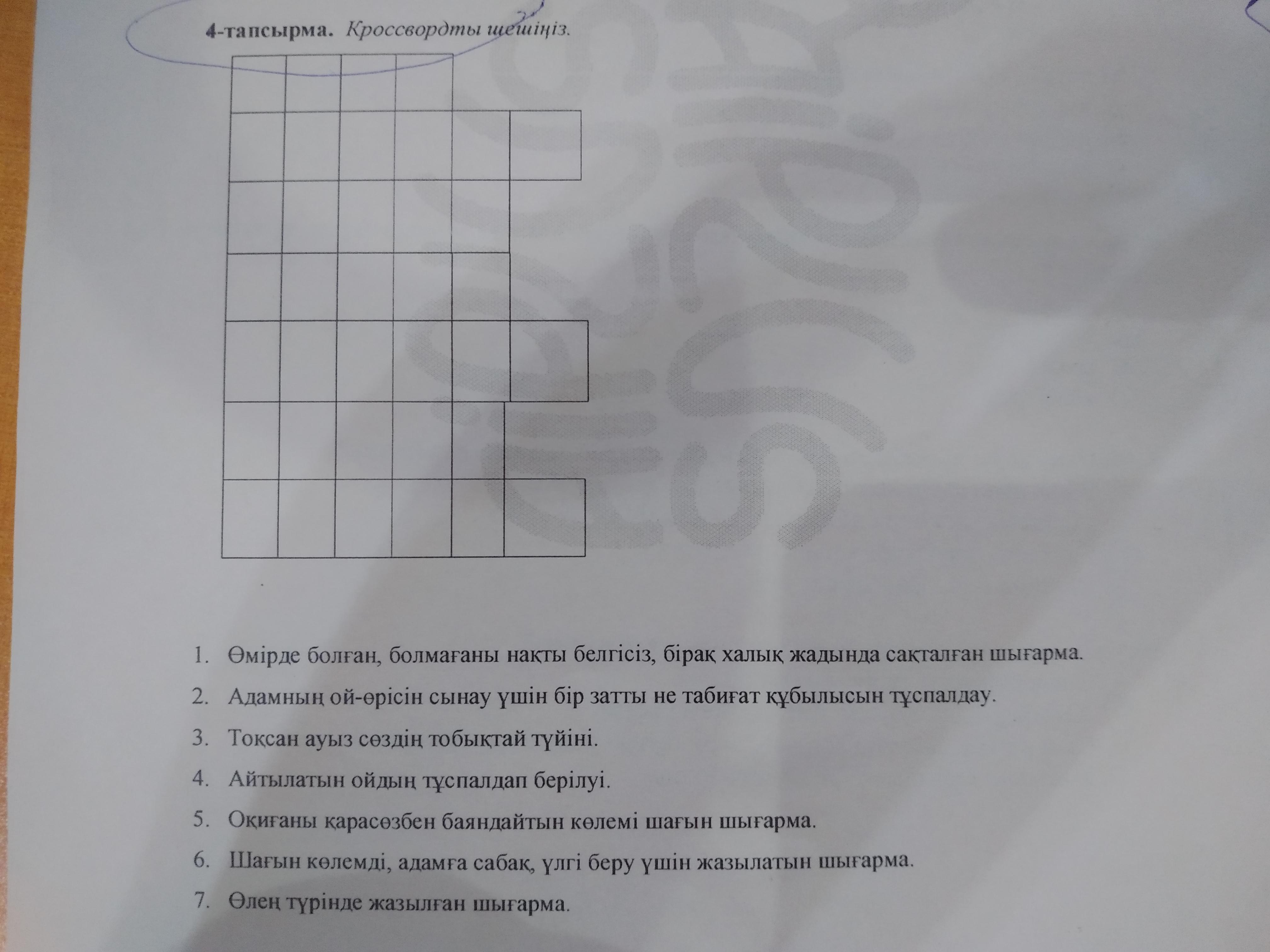 2.жұмбақ 3.мақал 4.мәтел 5. әңгіме 6.мысал 7.поэзия надеюсь кому то помагла
