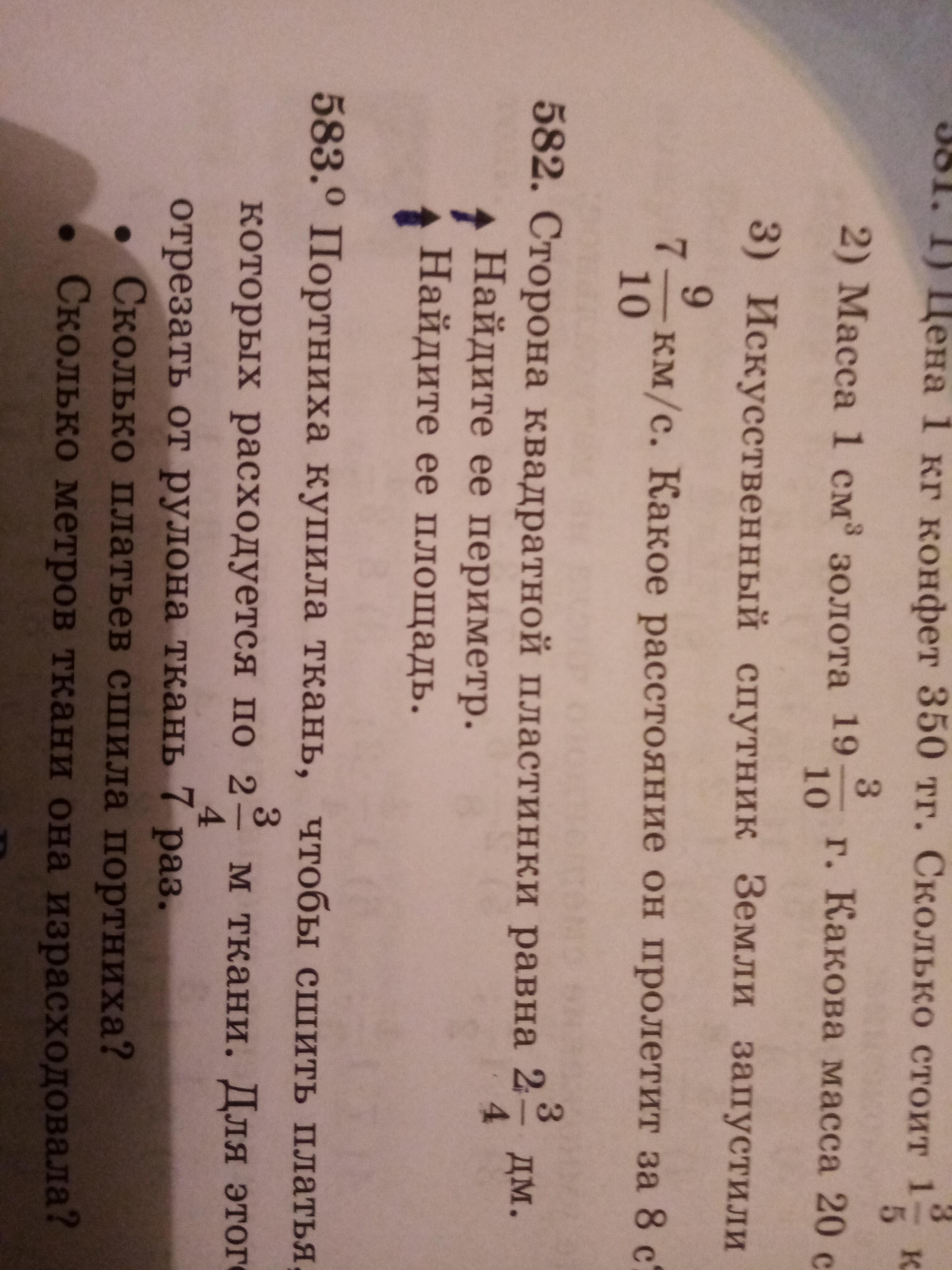 Помогите пожалуйста математика. 582. Сторона квадратной пластинки равна 2 3/4 дм.