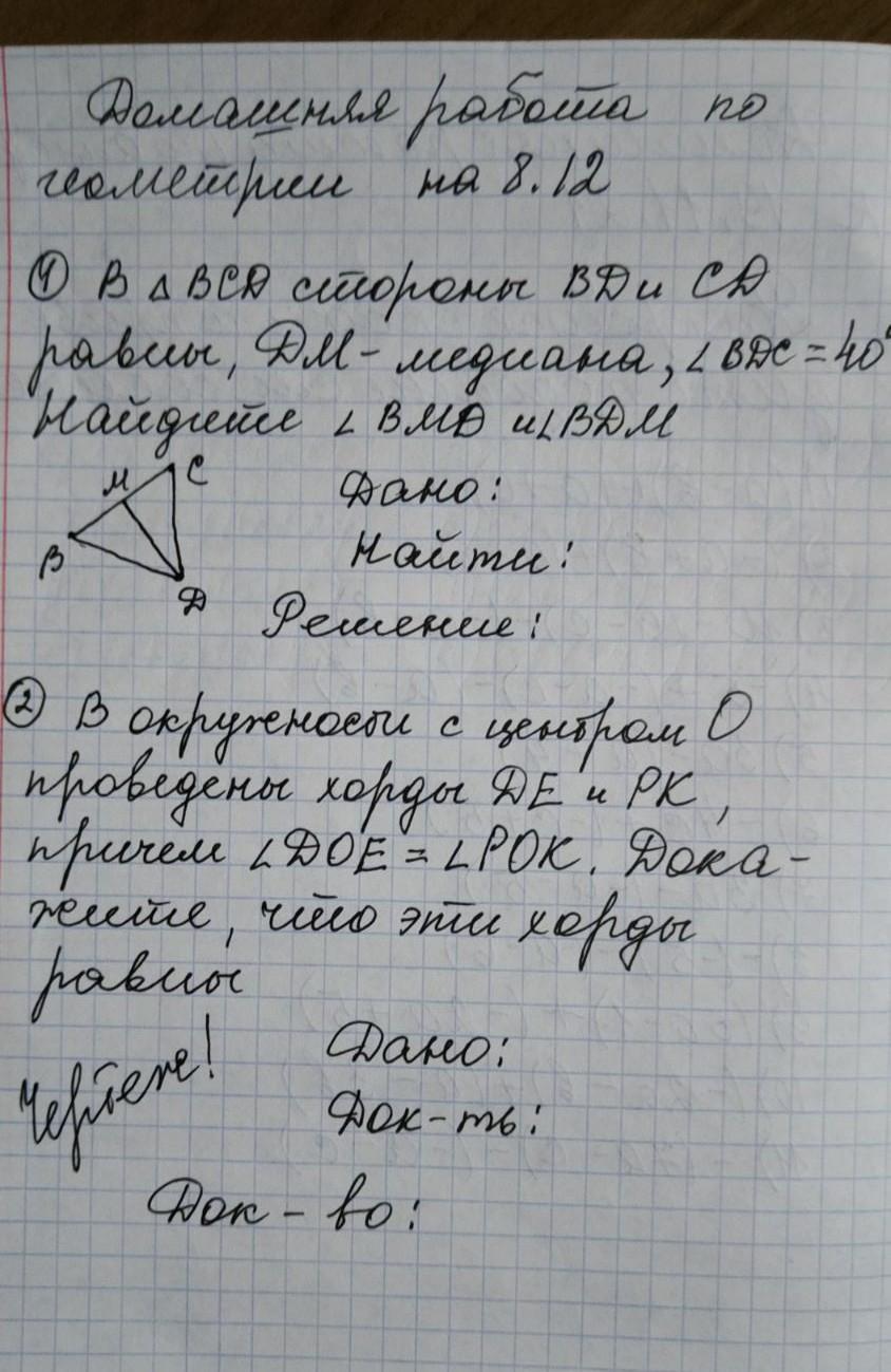 1. Медиана в равнобедренном треугольнике, проведенная к медиане - MD - является высотой и биссектрисой, то есть ∠BMD = 90°, ∠BDM = 1/2 ∠BDC = 1/2 * 40° = 20°