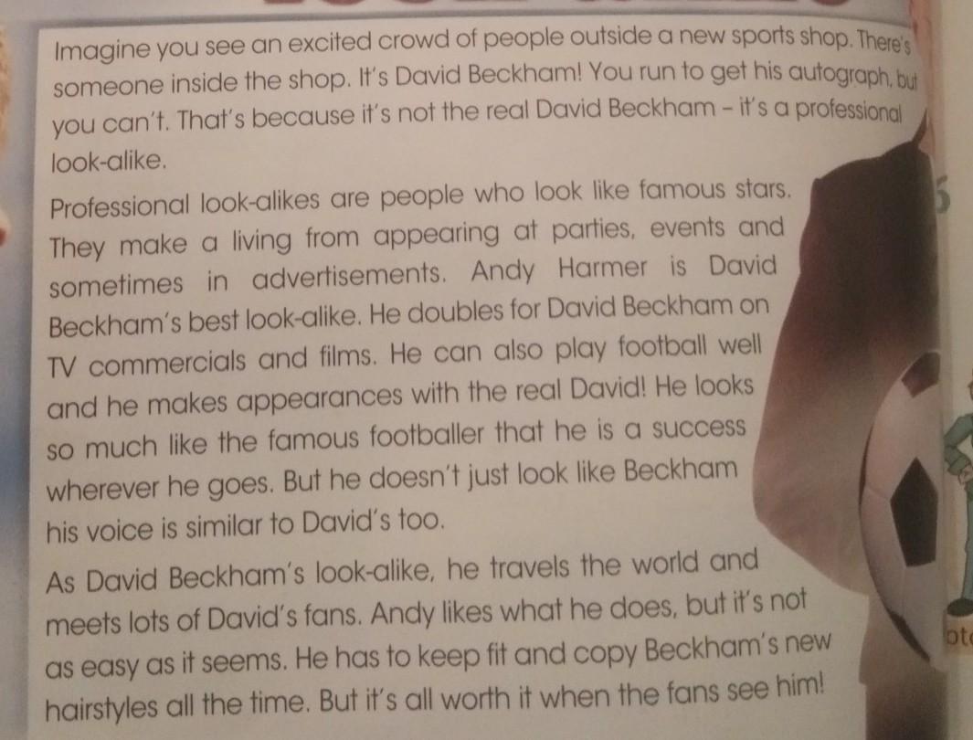 3 5.R5 Read the text again and mark the sentences T (true), F (fal, or DS (doesn't say). 1 David Beckham doesn't give autographs. 2 Andy Harmer is a professional footballer. 3 You can see Andy on television. 4 Andy and David sometimes appear together. 5 Andy doesn't talk like David Beckham. 6 David Beckham has fans all over the world. INI