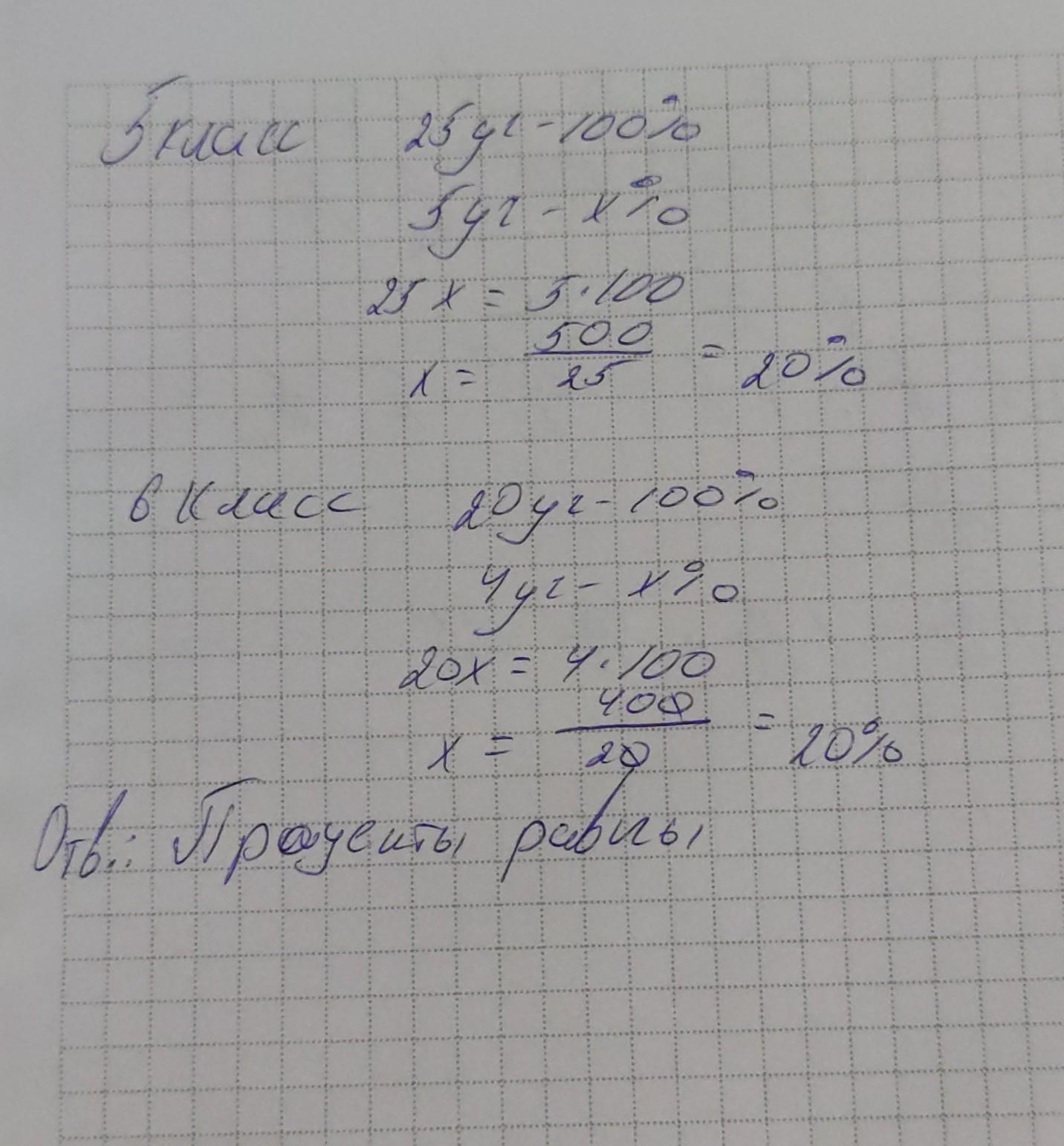 В 5-м классе пять из 25 учеников, а в 6-м классе четверо из 20 учеников получили оценку за четверть «5» по математике. Сравните процент студентов, получивших «5» в двух классах.