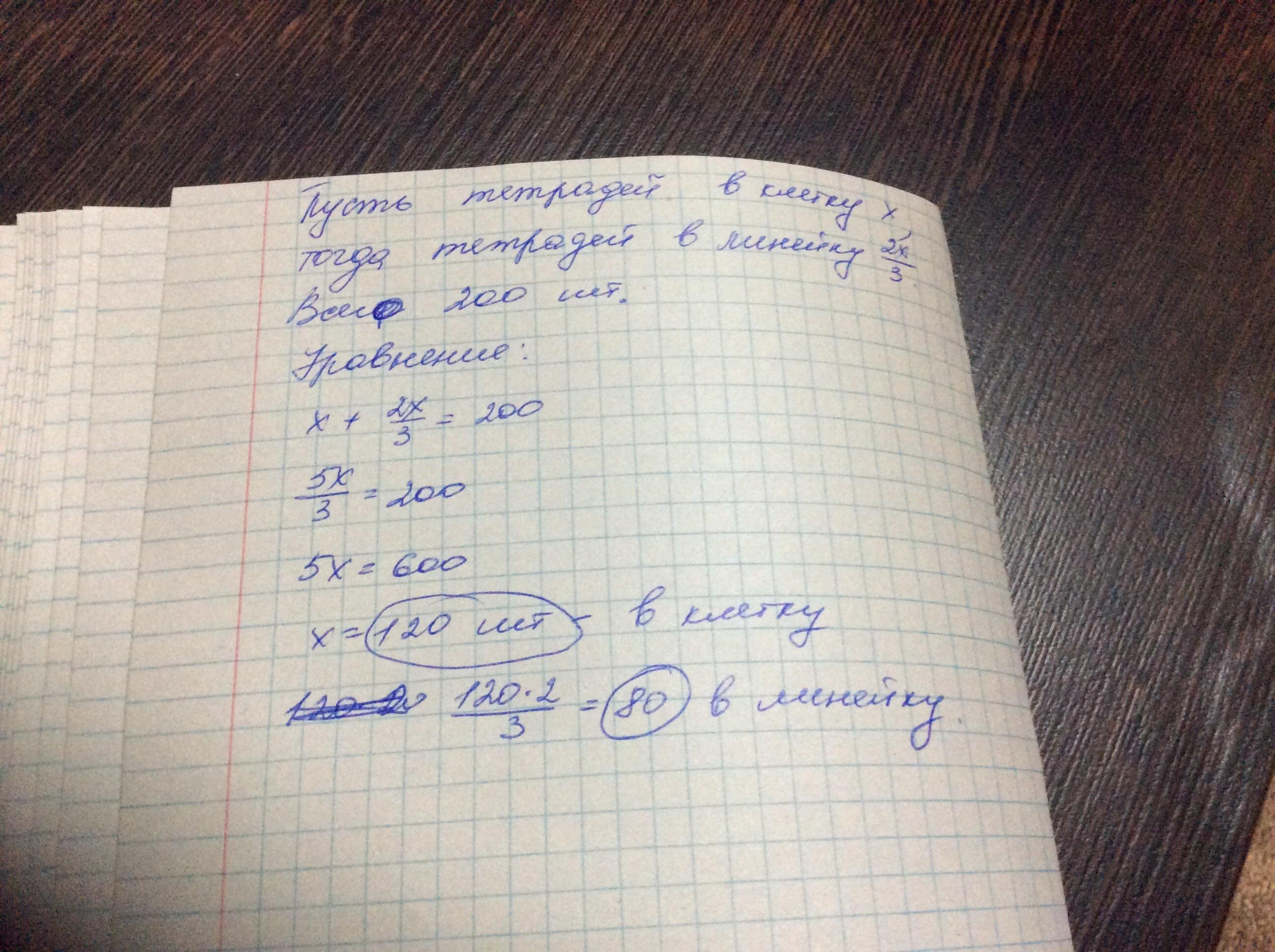 в начале учебного года было куплено 200 тетрадей в клетку и в линейку. при этом число тетрадей в линейку составляло 2/3 от числа тетрадей в клетку. сколько тетрадей в клетку и сколько в линейку было куплено в начале года?