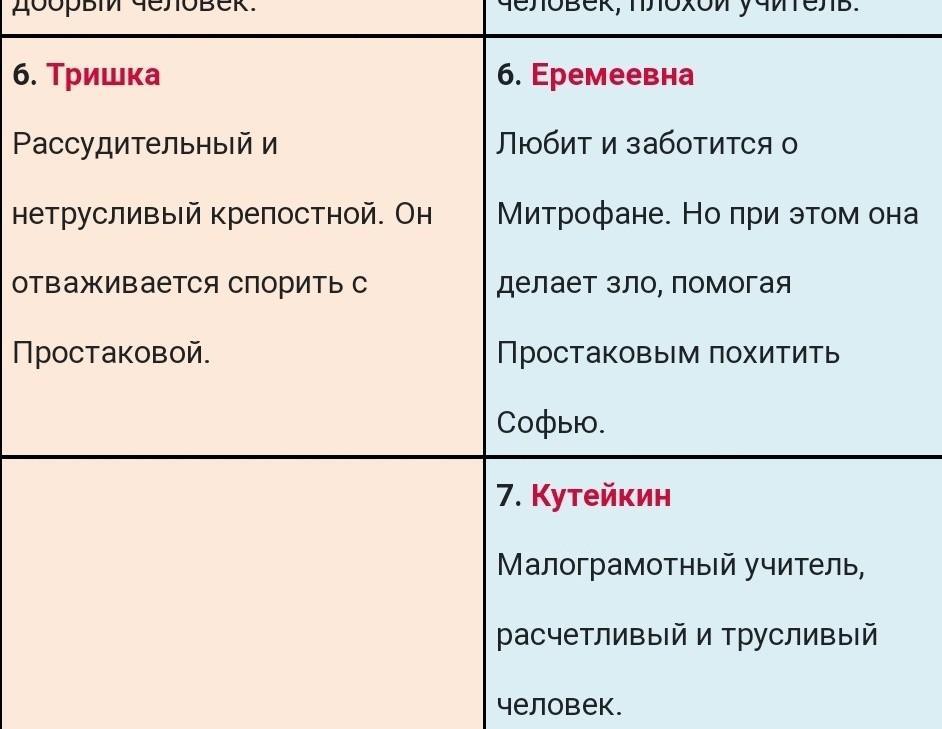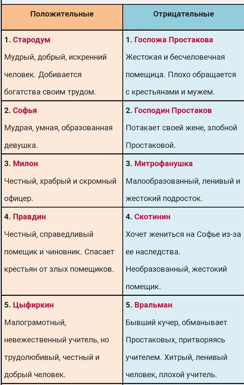 К числу отрицательных героев комедии относятся: Госпожа Простакова Господин Простаков Митрофан Простаков Тарас Скотинин учитель Вральман учитель Кутейкин Еремеевна