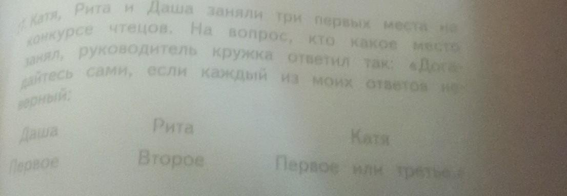 Катя не первое и не третье, значит второе. Даша не первое и не второе, тк второе Катя, значит Даша - третье. Рита не второе и не третье, значит первое.