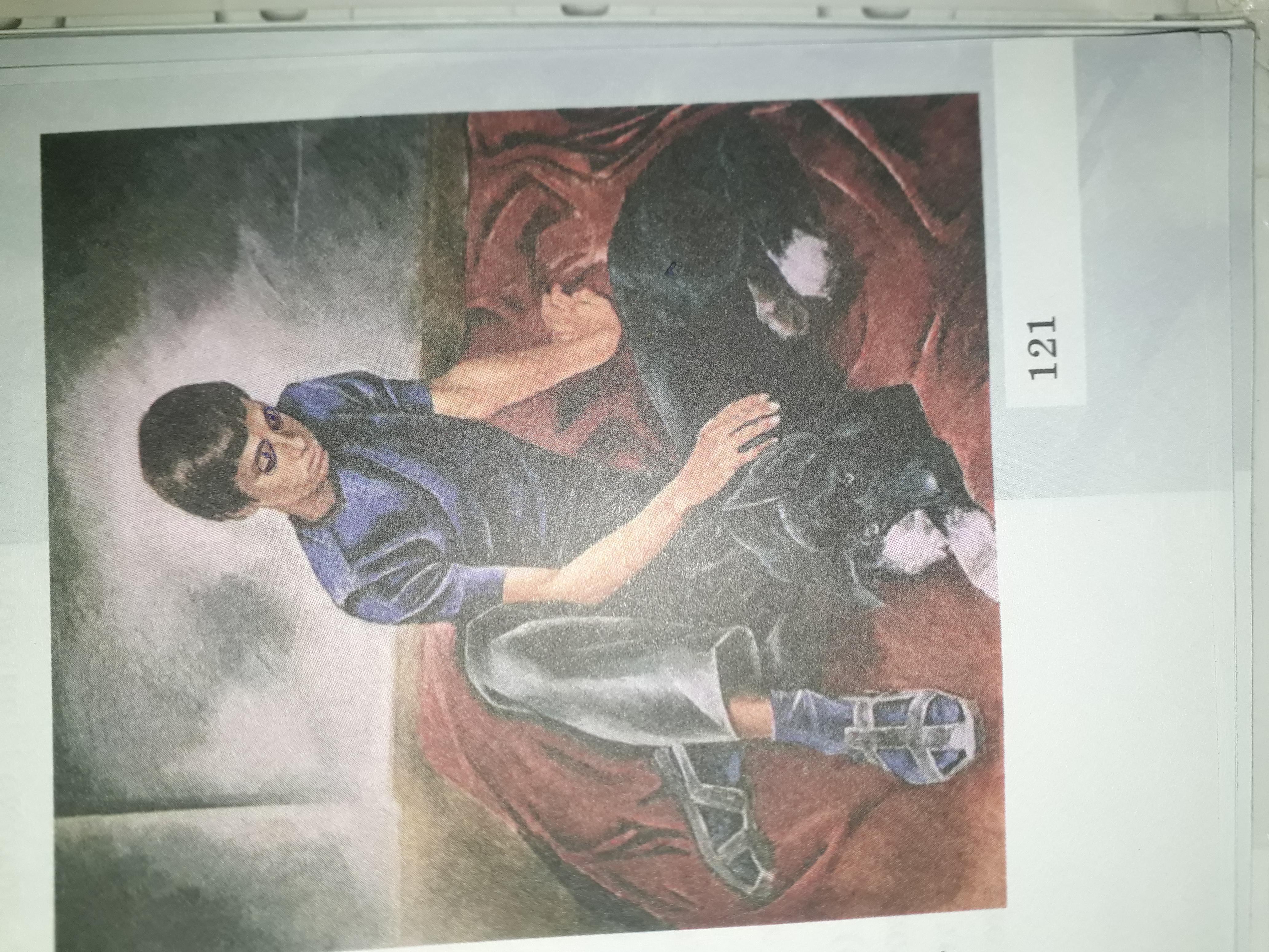 Создается впечатление, что герой откуда-то пришел в очень грустном настроении, и сразу же кинулся к своему другу-псу. Он присел к собаке на подстилку прямо в уличной обуви, и словно бы что-то рассказывает, делится своим горем. Мальчик склонился к ней всем телом и задумчиво гладит шерсть. Он как бы мысленно просит у друга помощи и совета