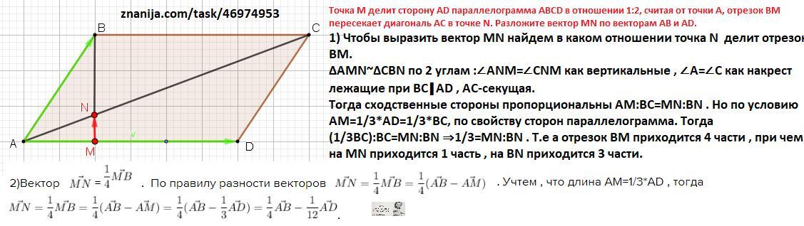 ДАЮ 50 БАЛЛОВ!! С объяснением, пожалуйста.. Точка М делит сторону AD параллелограмма ABCD в отношении 1:2, считая от точки А, отрезок ВМ пересекает диагональ АС в точке N. Разложите вектор MN по векторам АВ и AD.