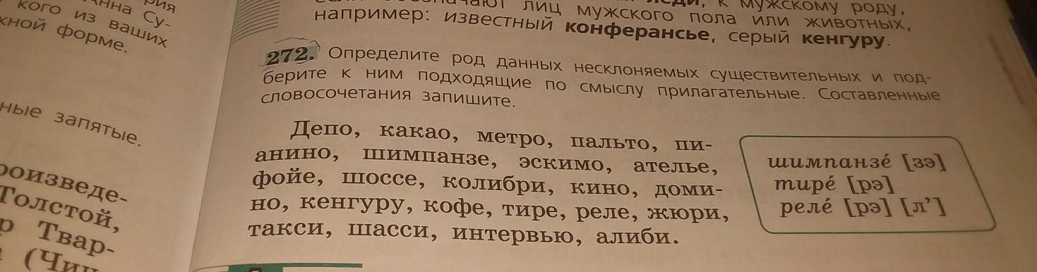 Троллейбусное депо, ср. род. Сладкое какао, ср. род. Утреннее метро, ср. род. Потёртое пальто, ср. род. Старое пианино, ср. род. Дикий шимпанзе, м. род. Большое эскимо, ср. род. Новое ателье, ср. род. Отделанное фойе, ср. род. Дальнее шоссе, ср.род. Проворная колибри, ж. род. Скучное кино, ср. род. Чёрно-белое домино, ср.род. Маленький кенгуру, м.род. Крепкий кофе, м. род. Незаметное тире, ср. род. Электрическое реле, ср. род. Несправедливое жюри, ср. род. Старое такси, ср.род. Сломанное шасси, ср. род. Популярное интервью, ср. род. Выдуманное алиби, ср. род.